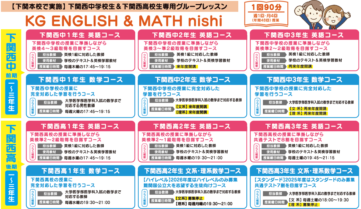 下関西中学校生と下関西高校生しか参加できない少人数生グループレッスンです。下関西高校は生徒によって成績差の大きい学校です。そのため、このレッスンではコースを「ハイレベル」と「スタンダード」にわけ、目標別に必要な対策を行っています。